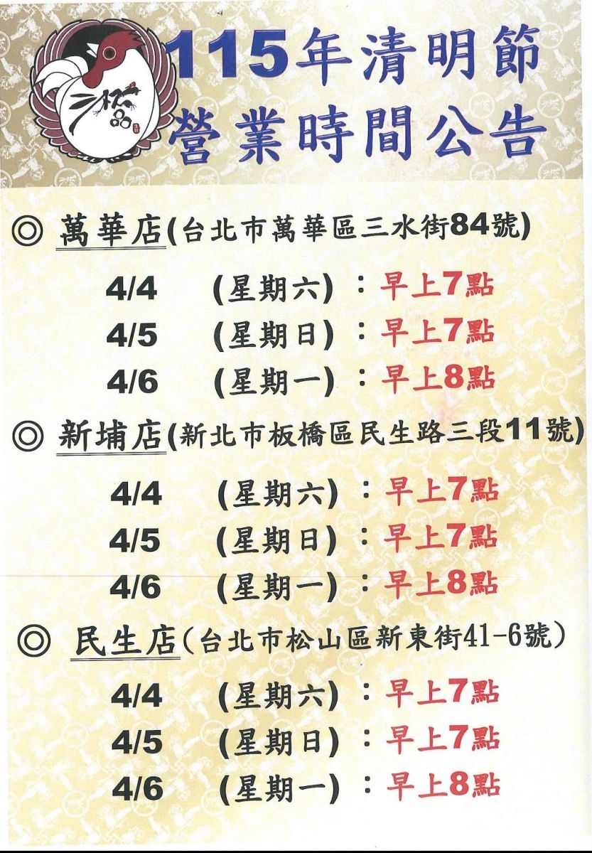 115年清明節(萬華店、新埔店、民生店)營業時間