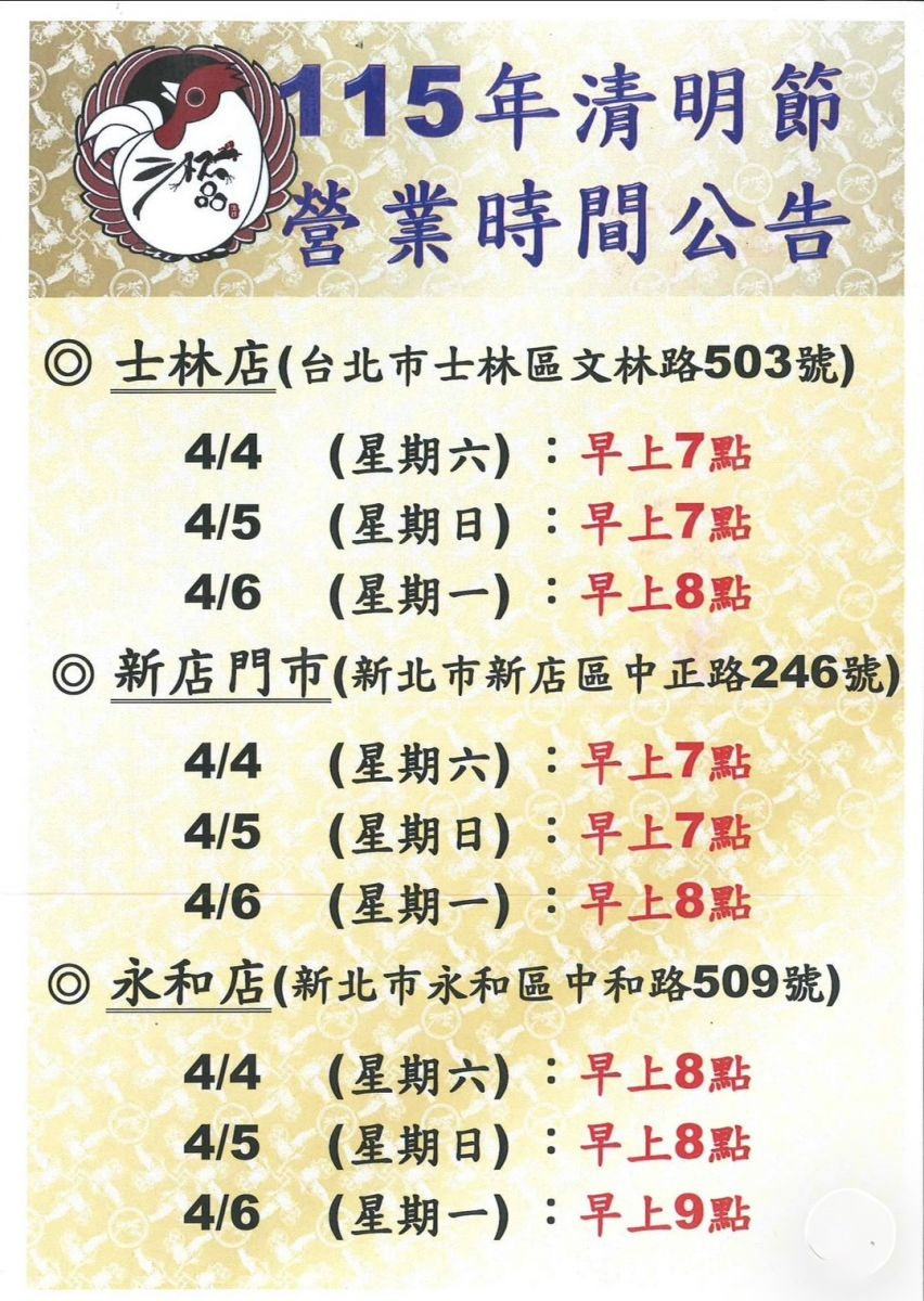 115年清明節(士林店、新店門巿、永和店)營業時間
